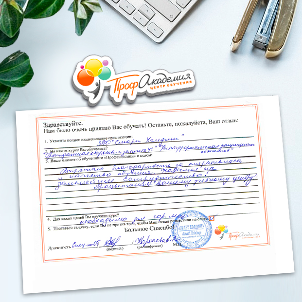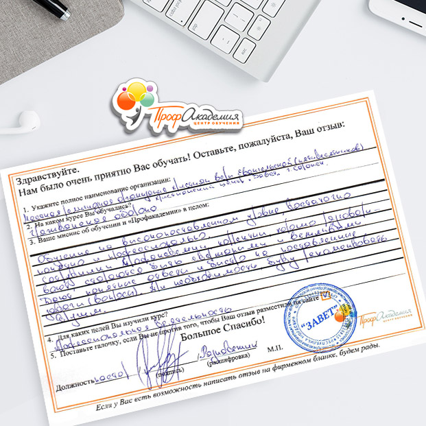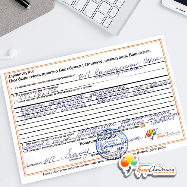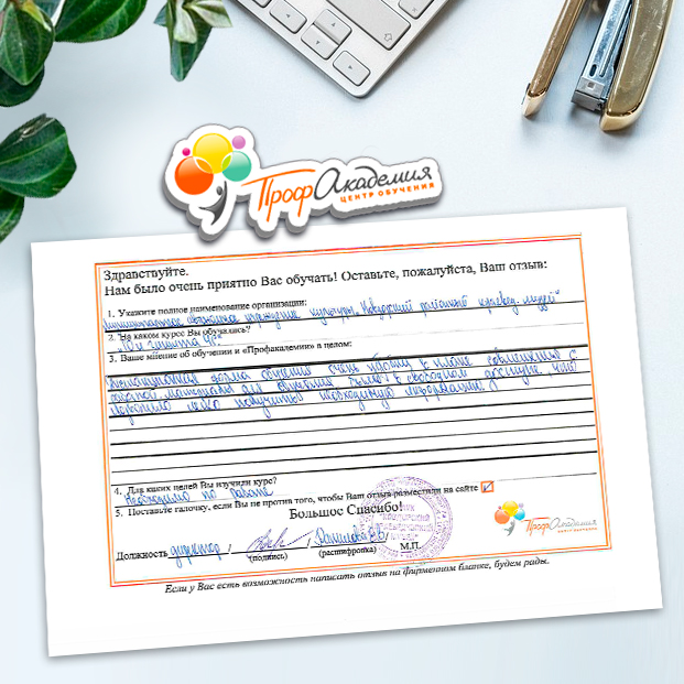 Огромное спасибо, всей команде “Профакадемии”, очень слаженная работа, быстро удобно, познавательно, есть время сделать заметки и разобраться в вопросах, узнать больше! Работаем уже несколько лет с Вами и очень довольны!!! Относитесь внимательно к любому клиенту, даже если обучается один человек, очень приятно! Спасибо всем! Процветания и стабильности