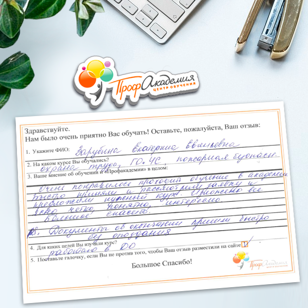 Основной плюс «Профакадемии» - это дистанционное обучение ГО и ЧС на сайте. Доступные, подробные лекции. Оперативная работа менеджера, который подробно отвечал на каждый интересующий вопрос. В дальнейшем планируем продолжить сотрудничество с «Профакадемией». Спасибо!