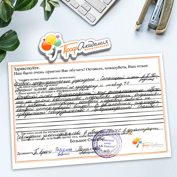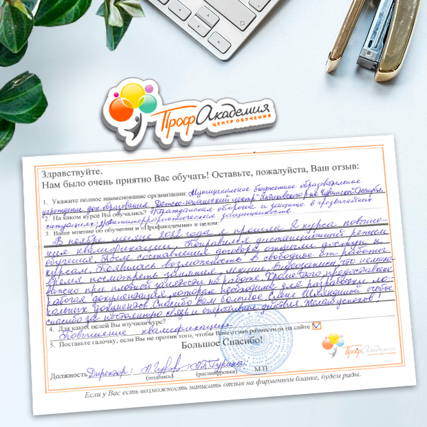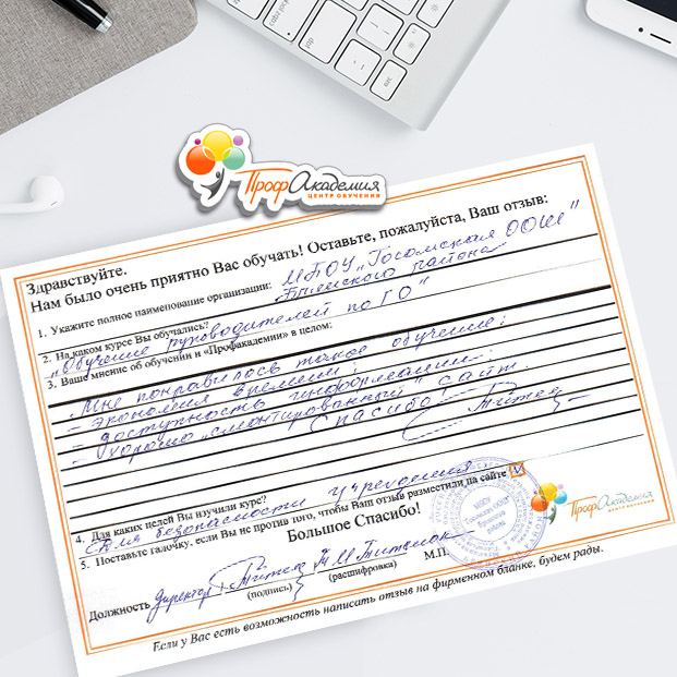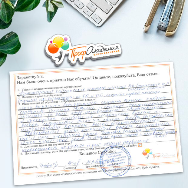 Для прохождения доп. проф. образ. для руководителя обращаемся в ПрофАкадемию почти 10 лет. Хотим отметить высокий профессионализм сотрудников, доброжелательность и надежность. Команда работает качественно, без задержек и накладок. Спасибо за ваш труд! Успехов и процветания!