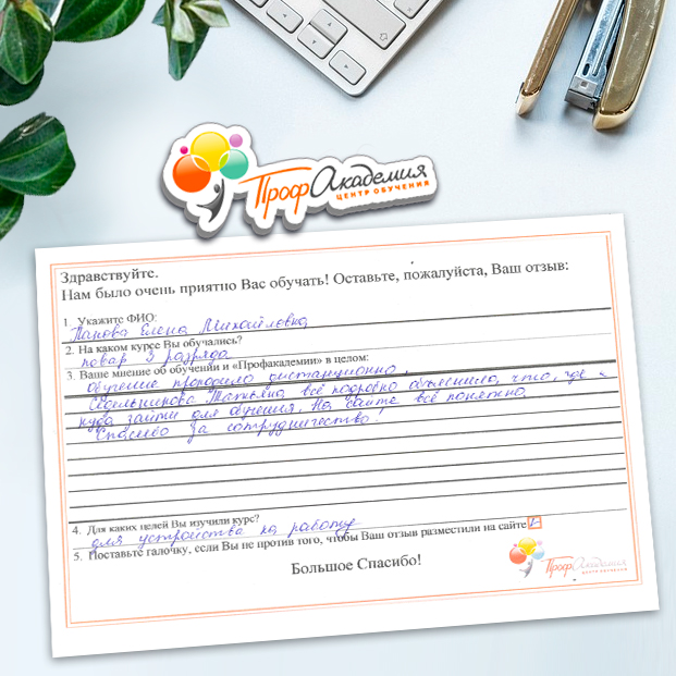Хочу выразить огромную благодарность, всей группе ПрофАкадемии. Понравилось всё. Вся информация об обучении находится в доступной форме. Очень боялась когда нашла обучение, но всё оказалось намного проще. Надеюсь всё что научилась за время обучения, станет замечательным фундаментом для моей новой жизни.